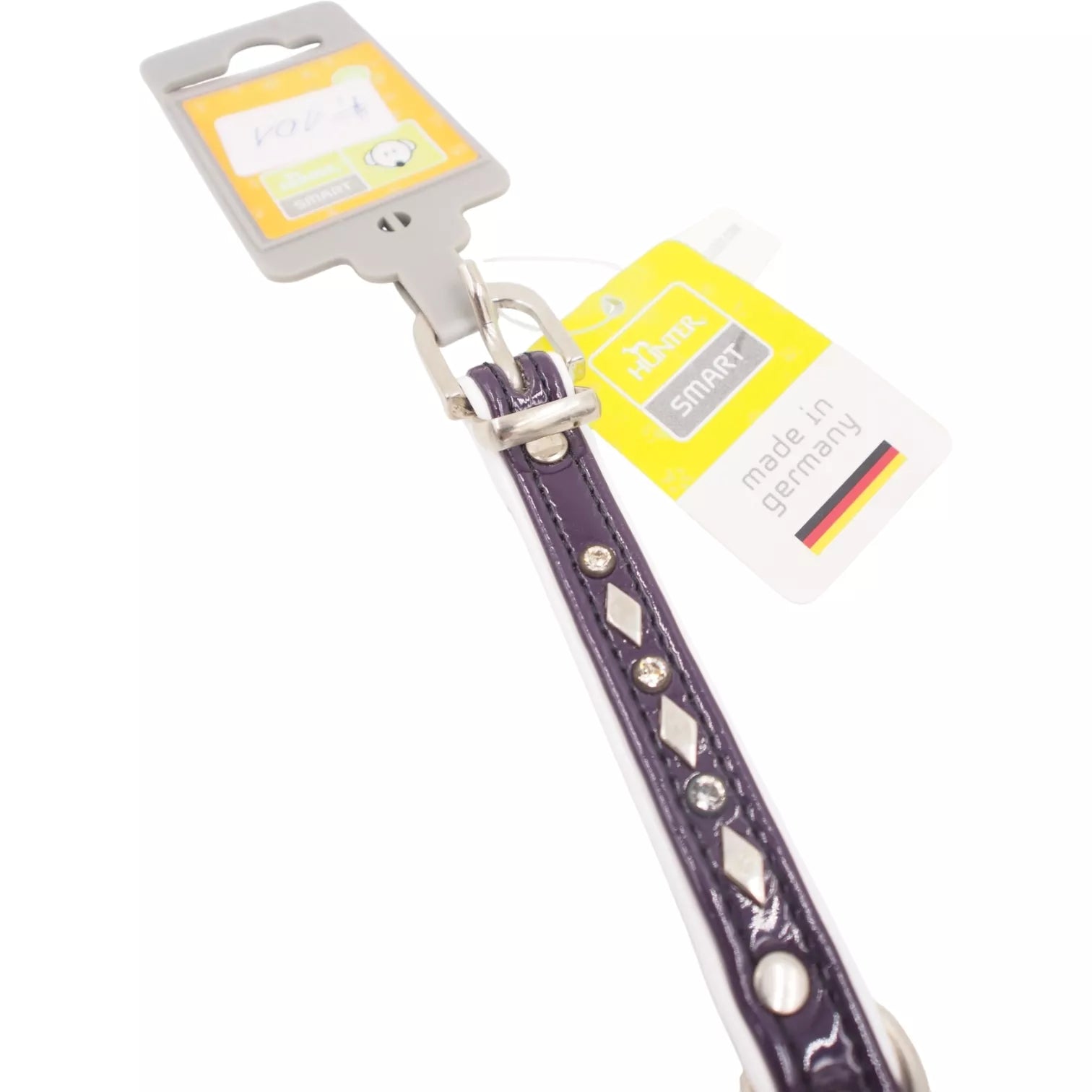 Stilingas ir elegantiškas **Hunter Smart** antkaklis – tai vokiškos kokybės ir išskirtinio dizaino derinys. Pagamintas iš aukštos kokybės dirbtinės odos, jis pasižymi maloniu švelniu paviršiumi ir itin kruopščiu apdirbimu. Violetinė spalva suteikia išskirtinumo, o dekoratyviniai metaliniai elementai ir žėrintys kristalai suteikia prabangos pojūtį.